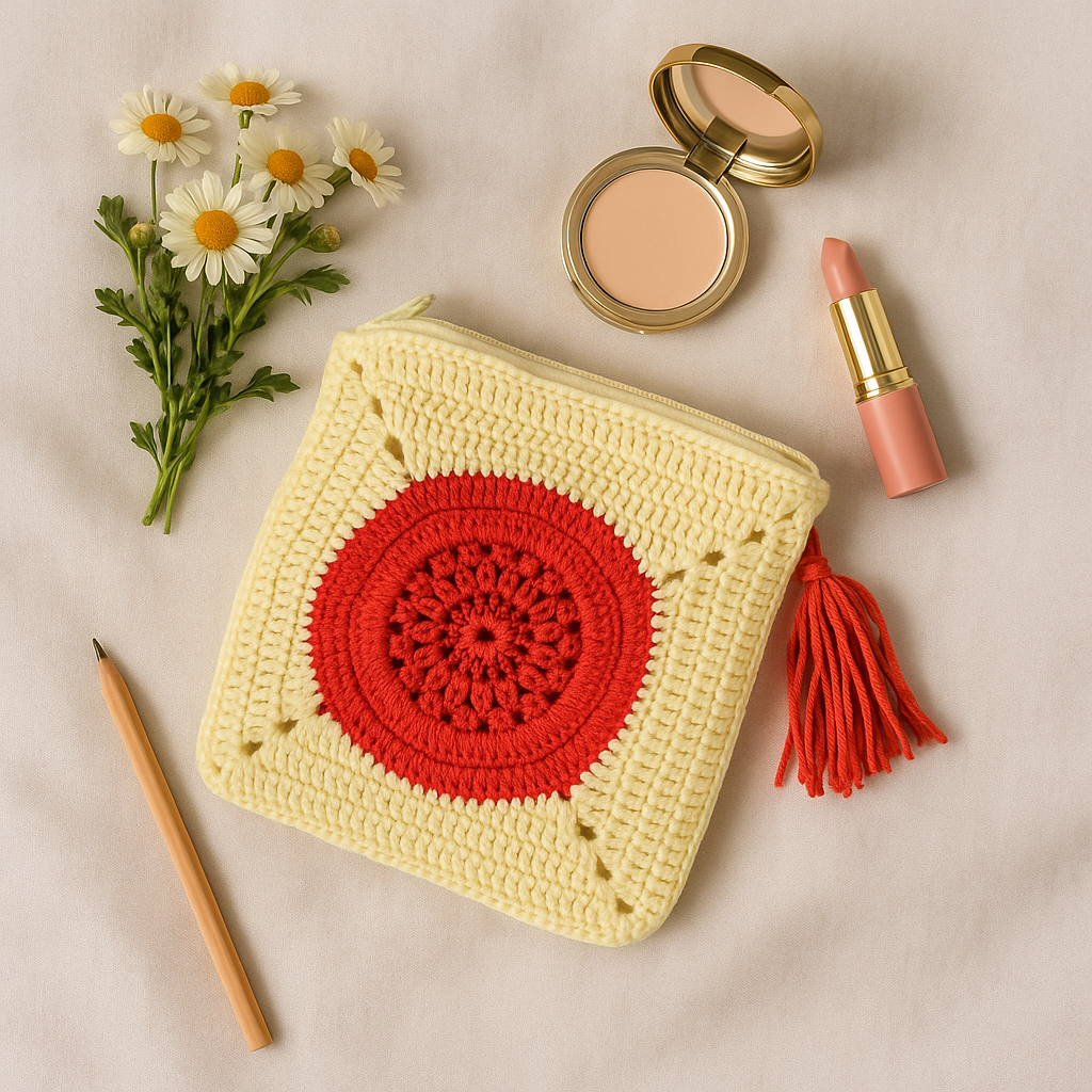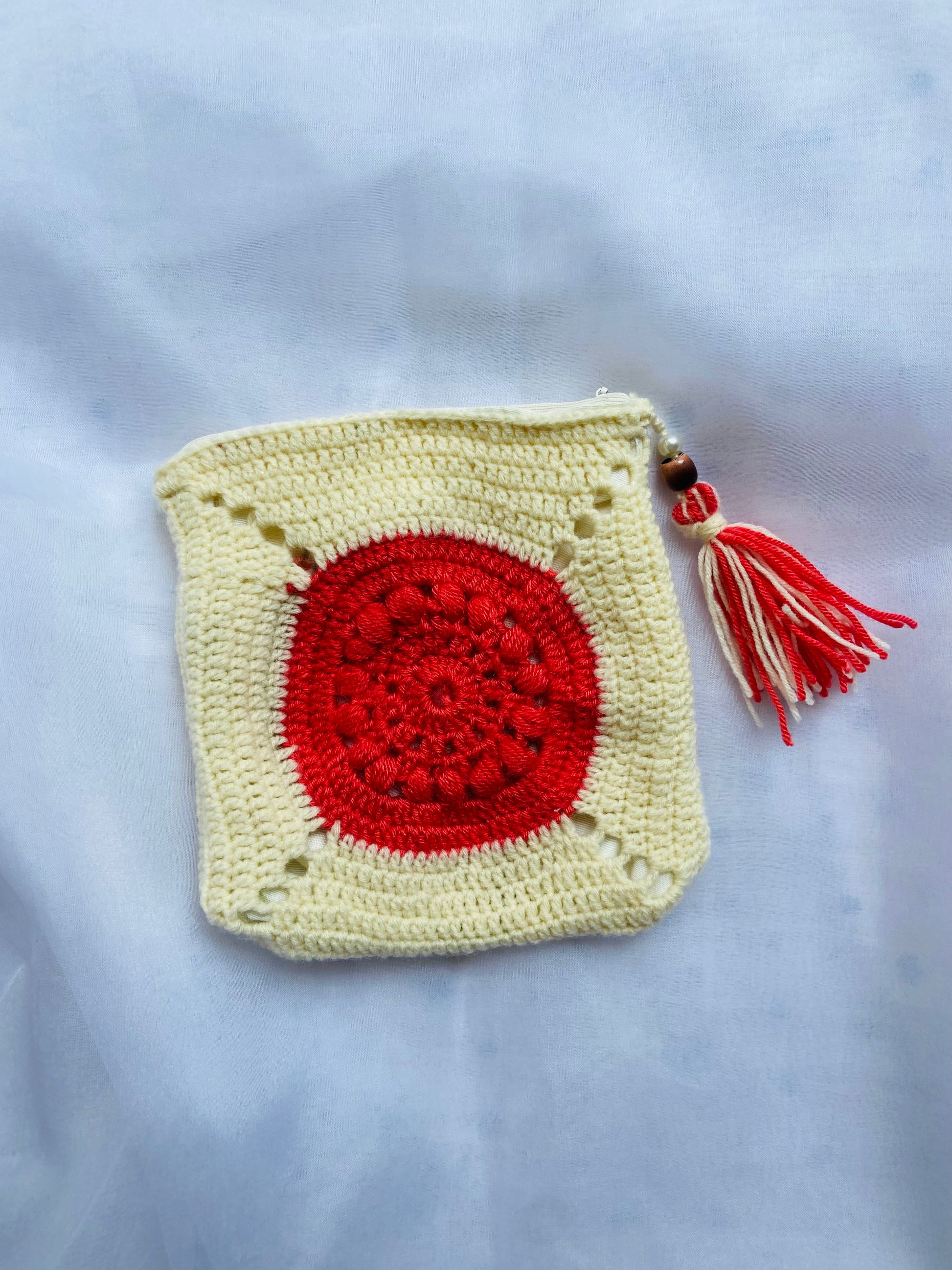Beautifully handcrafted crochet pouch with a vibrant red mandala design on a soft cream base
